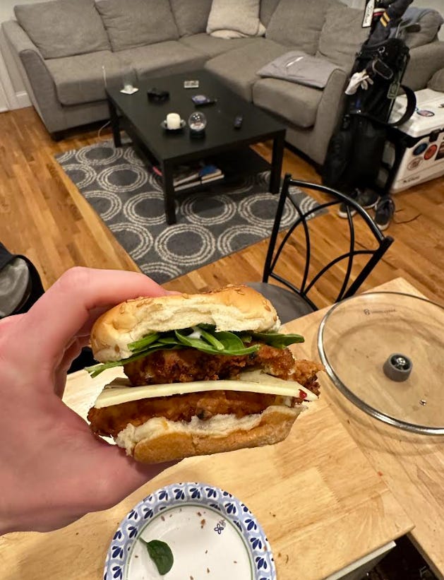 Another reason I’m cautious about May is my dinner situation for the month. As many of you know, the winner of the March Madness bracket challenge had the honor of choosing what food item I would eat for dinner for all 31 days of the great month of May. The winner was my friend Jay from college and the food is a home made chicken cutlet. Jay’s concern for both my wallet and general health are greatly appreciated. Last night, May 1st, was the kickoff of the month long challenge and I decided to shallow fry my freshly breaded chicken cutlet and put it on a sandwich with some pepper jack cheese, spinach, and my secret house-made aioli (mayo & hot sauce). The result was pretty delicious and I’m excited to see how talented I become at the art of making breaded chicken over the course of the month. Please LET ME KNOW of any good recipes that involve chicken cutlets or any unique ways you know of how to make them, as I’m sure I’ll run out of ideas by May 10th. Here’s my first attempt from last night: