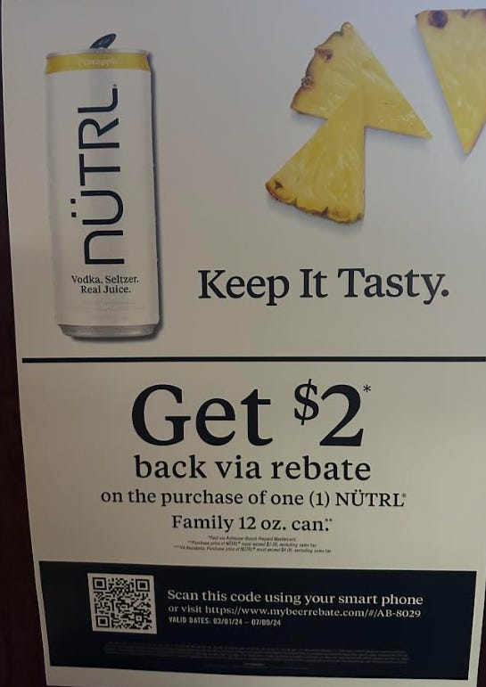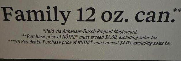 At first glance, it looks pretty normal. The rebate thing might be a little weird and I’ve never met someone who would voluntarily drink a Nutrl at a bar, but after a quick scan it just appears that you basically just get $2 off the purchase of a drink. Sounds like a good deal! But if you take a closer look at the outrageously small print at the bottom you’ll notice that the the requirement for the promo is just ridiculous.