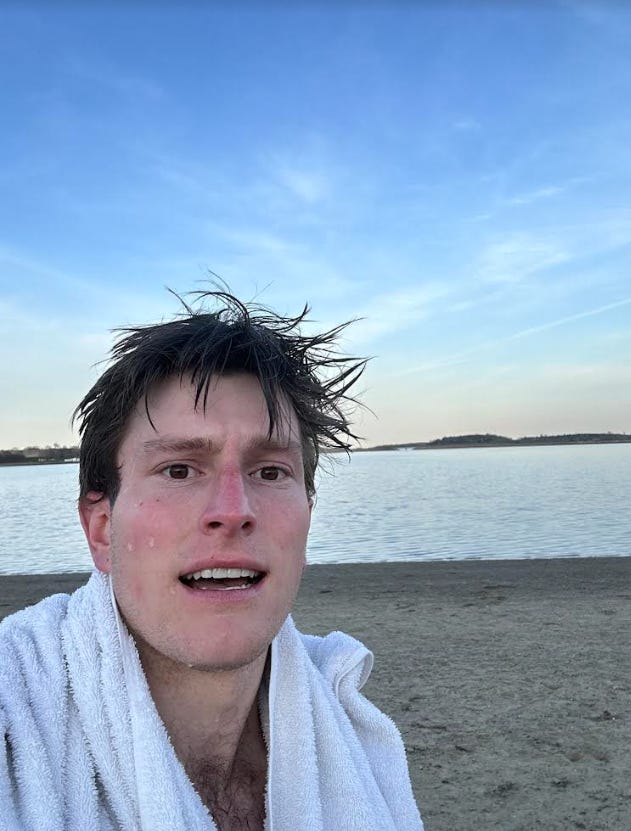The cold plunges are going well, and they’re getting progressively easier as the weather warms up and I get used to the waters of castle island. I do feel bad, however, for the family trying to take a memorable family photo right in my usual swimming spot yesterday. I take pride in knowing that I’ll probably be splashing around in the background of their 2024 Christmas card. Be on the lookout for that! I’ve been sending these pictures to my family group chat and their responses have gotten increasingly more supportive as the weeks go by (potentially out of pity, but a win is a win). Here I am on the white sand (dark gray) beaches of South Boston!