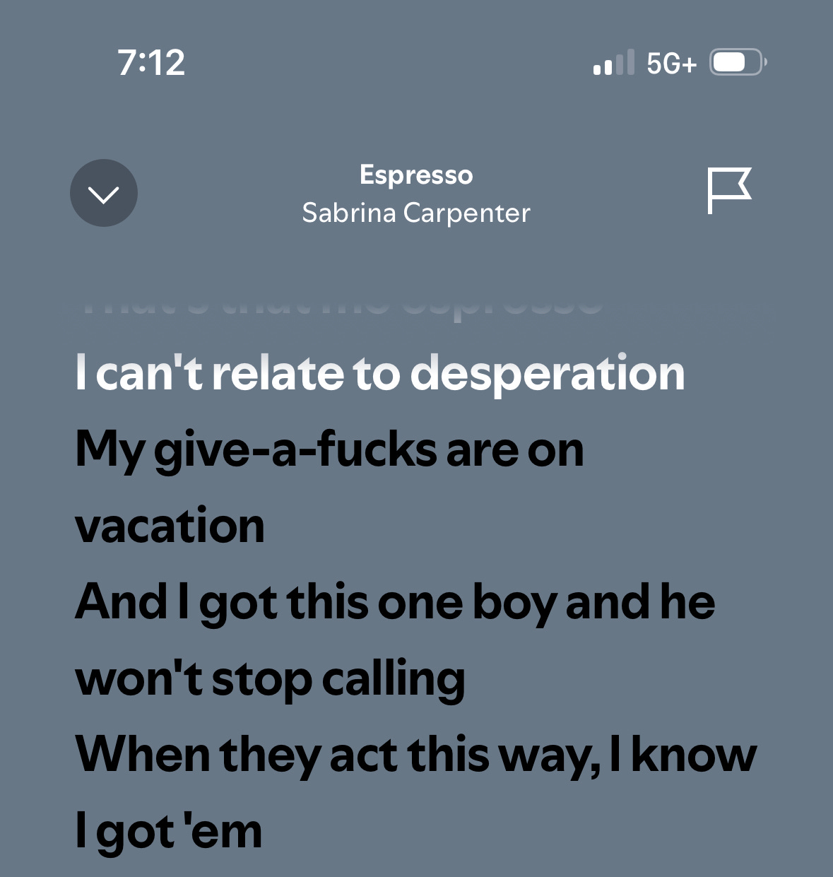 The whole point of Espresso is that one of SC’s former lovers simply can’t sleep at all knowing that he fumbled her, which is fair. This person has apparently become pretty desperate and “won’t stop calling”.